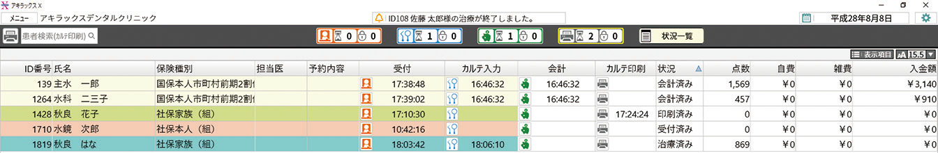 「状況一覧」ボタンをクリックすれば、受付・診療室のどのPCからでも、院内の業務進行状況を一覧で確認することができます。「受付は滞っていないか?」「治療待ちの患者さんは?」といった知りたい情報も、瞬時に把握することができます。