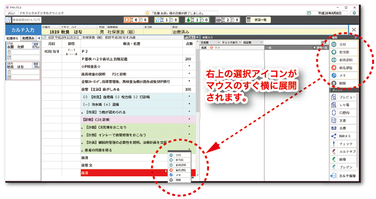 マウスの移動距離をできる限り短くすることは、操作性の向上に直結します。カルテ入力時、次なる操作を選ぶのは、マウスのすぐそばに表示されるアイコンから選択できます。忙しいドクターにうれしい機能です。