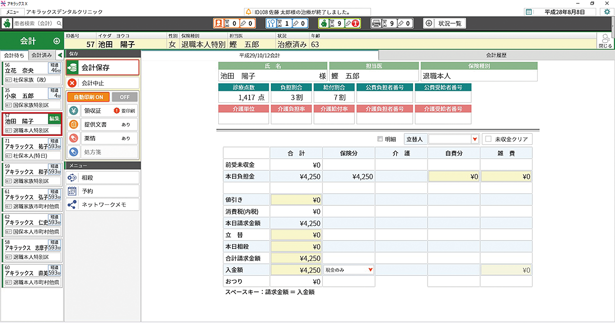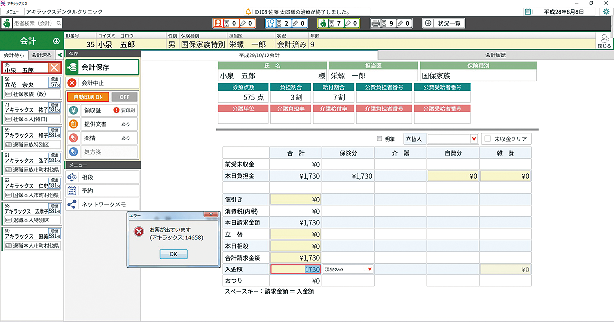 窓口での会計は基本的にスペースキーを押すのみ。領収書、処方せん、治療計画書などの印刷物は、システムが患者さんごとに自動的に判断して印刷します。受付業務の効率化を徹底して追求しました。
