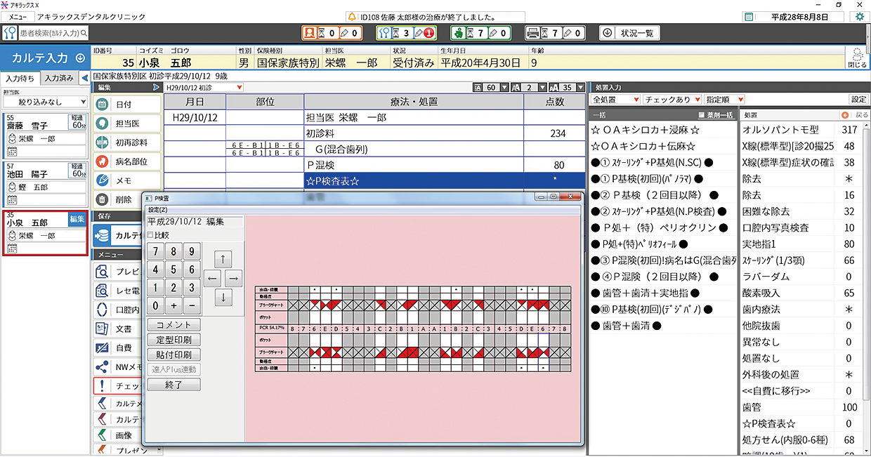 ポケット、プラークチャート、動揺度、出血、拝膿を前回と比較、変更箇所を修正して入力が行えるので、診療中の忙しい最中でも、無理なく扱うことができます。 ※ ㈱ナルコーム『達人プラス』シリースと連動させデータインポートが可能です。