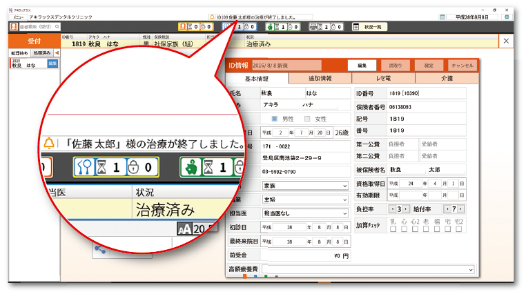 受付端末には、診療室で治療が終了した患者さんの情報を「ポップアップメッセージ」で伝えます。会計・配布する印刷物の準備等、受付業務に必要な情報を的確に伝え、院内コミュニケーションをスマートにサポートします。