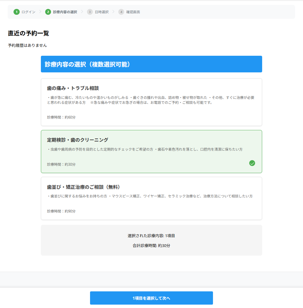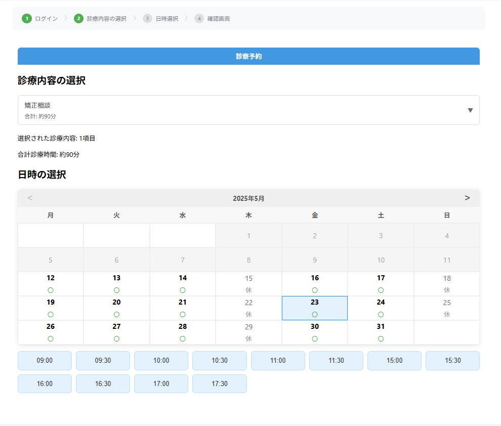 予約可能は日時がカレンダーに「◯印」で表示されていますので、自身の予約可能な日時を選択します。