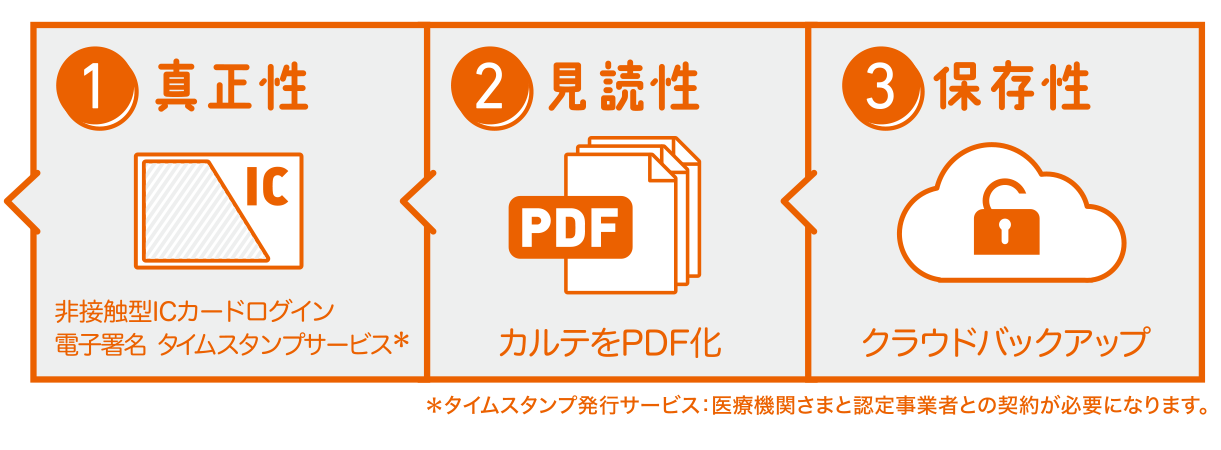 | データの「真正性」を担保するため「いつ・どこで・だれが」記録したかを明確にします。 入力者の権限を与えられた方はIDとパスワード入力して電子カルテシステムにログインします。ログイン後は作成された記録に対して操作・入力者・PC名等の履歴を残し信頼される電子カルテになります。 そこで非接触型ICカード(*1)による「スマートログイン」の登場です。非接触型ICカードをかざすだけで煩わしいログイン操作から解放され快適に電子カルテシステムを運用できます。 |